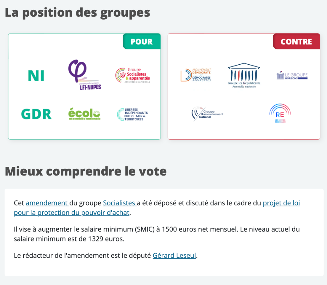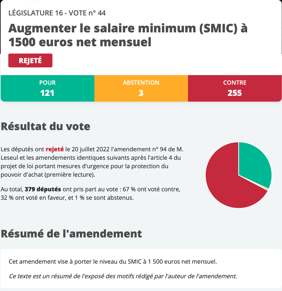 - Trouvé sur le site de vulgarisation parlementaire « DATAN »: https://datan.fr. Un amendement déposé par le PS pour augmenter le SMIG à 1500 € et montrant des votes bien tranchés: